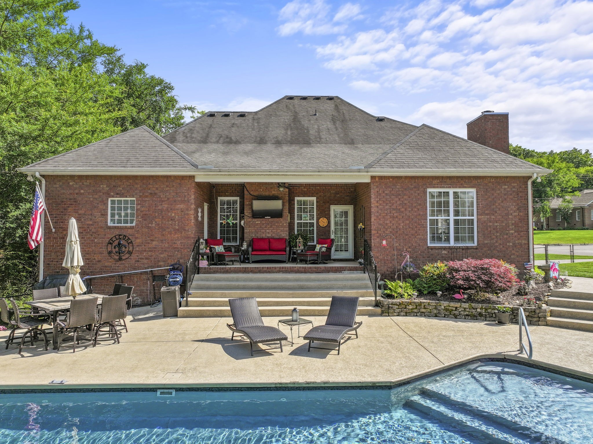 FALL in LOVE with this HOME! Seller offering $10,000 towards Buyer's closing cost OR rate buy down with reasonable acceptable offer. Highly sought-after Stonewood neighborhood. Come inside this beautiful well-maintained property offering a serene and private backyard retreat. Features sparkling in-ground salt water pool with plenty of outdoor living space to relax and entertain. Featuring main-level primary suite, soaking tub with separate shower and separate walk-in closets, plus additional bedroom and full bath on the main level-ideal for guests or multi-generational living. Cozy hearth room with wood burning fireplace adjoins gourmet kitchen with double ovens, granite counter-tops, large island for seating and walk-in pantry. Gleaming hardwood floors throughout downstairs. Soaring high ceilings and 2nd cozy fireplace in living room. Additional 2 bedrooms and full bath on 2nd floor. Spacious bonus room upstairs includes additional flex room for office space/exercise or craft room. Ample storage in 3 attic areas- 1 being largest walk-in space. 3 car attached garage extra space for boats, golf carts, hobbies. Backyard completely fenced with gates. See this beauty for yourself. Schedule a showing today!